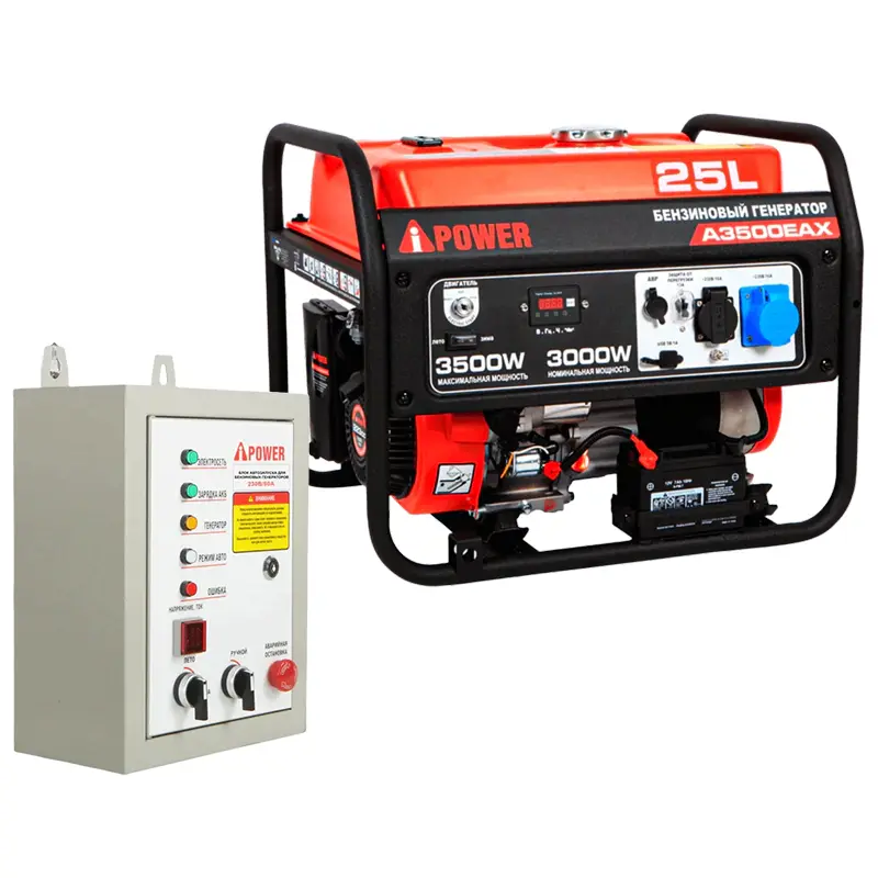 Бензиновый генератор A-iPower A3500EAX оснащен электростартером и разъемом для подключения блока автоматического ввода резерва — АВР. Отличительная черта этой модели — способность выдерживать кратковременную индуктивную нагрузку в 7 кВА, что позволяет подключать потребителей с высоким пусковым током. Устройство служит автономным источником однофазного тока для различного электрооборудования, в совокупности потребляющего 3 кВт. Благодаря большому топливному баку на 25 л электрогенератор работает без дозаправки в течение 14 часов при 100%-ной нагрузке.