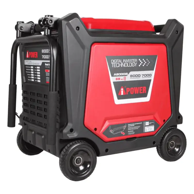 Инверторный бензиновый генератор A-iPower A8000iS пригодится в качестве резервного источника однофазного тока стабильной частоты и напряжения на случай сбоев в центральной системе электроснабжения. Подходит для автономного питания компьютеров, котлов отопления, других чувствительных электронных устройств, суммарная потребляемая мощность которых составляет 7 кВт. Генератор оснащен разъемом для подключения блока автоматического ввода резерва — АВР. Работает от четырехтактного бензинового двигателя мощностью 16 л.с. с электростартером. Одна заправка топливного бака емкостью 26 л обеспечивает 6 ч непрерывной работы при 100%-ной нагрузке. Уровень шума не превышает 68 дБ.