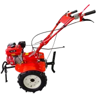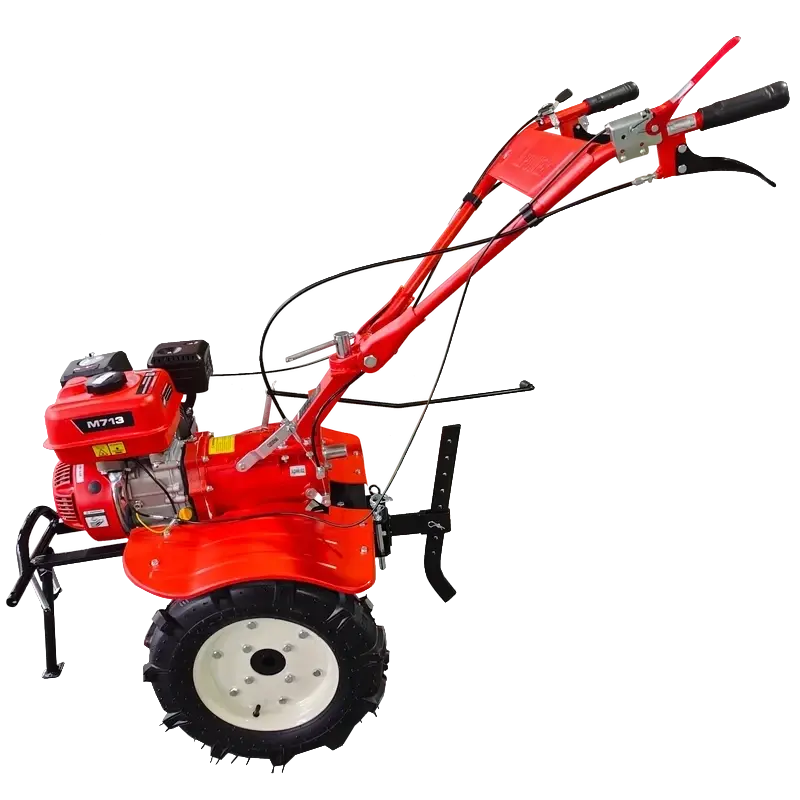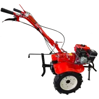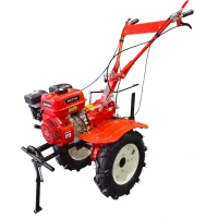 Мотоблок оснащен двумя большими пневматическими колесами с глубокими протекторами, обеспечивающими отличную сцепку с землей. Техника отличается широкой функциональностью и оснащена креплением для навесного оборудования, выполняющего покос травы, возделывание почвы, уборку снега и др.