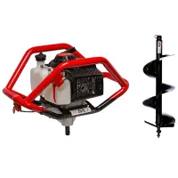 Мотобур ADA Ground Drill 8 без шнека относится к инструментам профессионального класса и рассчитан на пользование одним или двумя операторами. Он оборудован мощным двигателем и имеет особую конструкцию рамных ручек. Бензиновый бур используется для земельных и строительных работ. С помощью данной модели можно бурить скважины и лунки диаметром до 25 см для установки столбов, рыть колодцы, ямы под фундамент, выполнять садовые работы различного характера. Отличительные особенности мотобура ADA Ground Drill 8: Мощный усовершенствованный двигатель. Легкий запуск при любой погоде. Рамная конструкция особой формы. Быстросъемное соединение для шнека. Двойной рычаг газа. Удобное хранение и транспортировка. Моторный бур оснащен бензиновым двигателем мощностью 3,26 л.с., который позволяет выполнять работы даже на твердой или мерзлой земле. Мотор охлаждается системой воздушной вентиляции и бесперебойно функционирует даже при продолжительной эксплуатации. Это гарантирует надежный рабочий процесс на стабильной мощности. Бензобур легко запускается при любом температурном режиме благодаря ручному стартеру с воздушными заслонками. При этом переключатель должен находиться в позиции «ON». Достаточно одного продергивания тросика и бур готов к работе. Особая цельнорамная конструкция ручек позволяет оптимально передавать усилие на рабочий инструмент благодаря сбалансированному центру тяжести. Кроме того, металлические дуги рукояток выполняют защитную роль, оберегая двигатель от повреждений, например, в случае падения бура. В данной модели бензобура может применяться любая рабочая оснастка диаметром до 25 см. Шнек присоединяется к приводу с помощью быстросъемной шпильки. А сам процесс установки и замены рабочих инструментов не занимает много времени и сил. Бензиновый бур рассчитан для использования одним оператором или работы в паре. Продуманная конструкция и двойной рычаг газа позволяют комфортно работать двум операторам, оптимально синхронизируя действия для большей продуктивности и лучшего результата. Компактная рама из ручек способствует простой транспортировке и удобному хранению. Бур не нужно разбирать, стоит отсоединить только шнек. Он легко помещается в багажнике автомобиля и не занимает много места при хранении. В комплект поставки так же включен ADA Drill 250