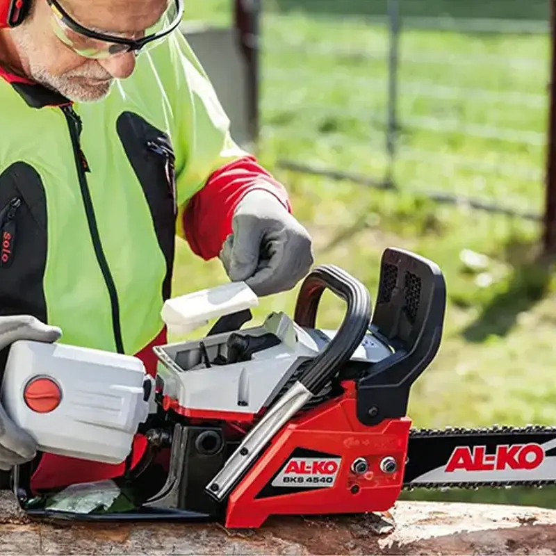 Бензопила AL-KO BKS 4540 имеет прорезиненные ручки, обеспечивающие надежный крепкий хват. Отверстия для заливки топливной смеси и масла находятся рядом на корпусе и имеют удобный к ним доступ. Система предварительной подкачки топлива в карбюратор облегчает запуск холодного двигателя. Крышка отсека с воздушным фильтром открывается и закрывается без использования специальных инструментов. Подачу масла в автоматическую систему смазки цепи можно легко отрегулировать с помощью винта на днище. На пластиковом корпусе находятся наглядные схематические изображения, подсказывающие, например, направление зубьев при установке цепи или пропорции масла и бензина для топливной смеси.