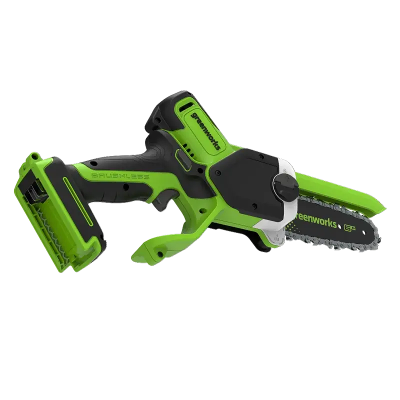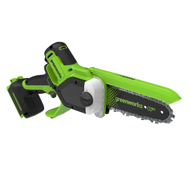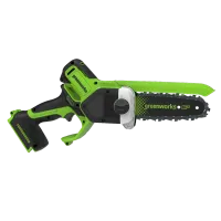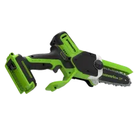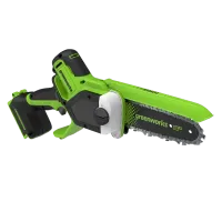 Цепная аккумуляторная мини-пила Greenworks GD24CS15 - компактная бесщёточная цепная пила с шиной 15 см, которая отлично справится с заготовкой дров в походе, а также поможет с обрезкой веток и сучьев на даче или с распилом досок на стройплощадке.