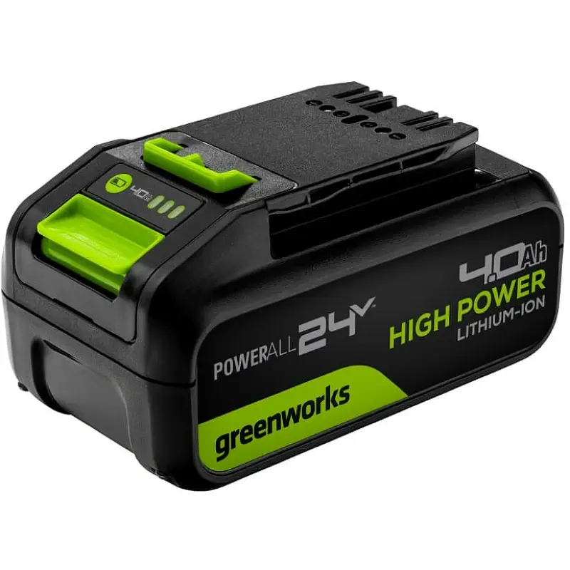 В комплект поставки также входят Аккумулятор Greenworks G24HP4 (4 Ач, 24 В) и Зарядное устройство Greenworks G24UC2 (24 В, 2 А)