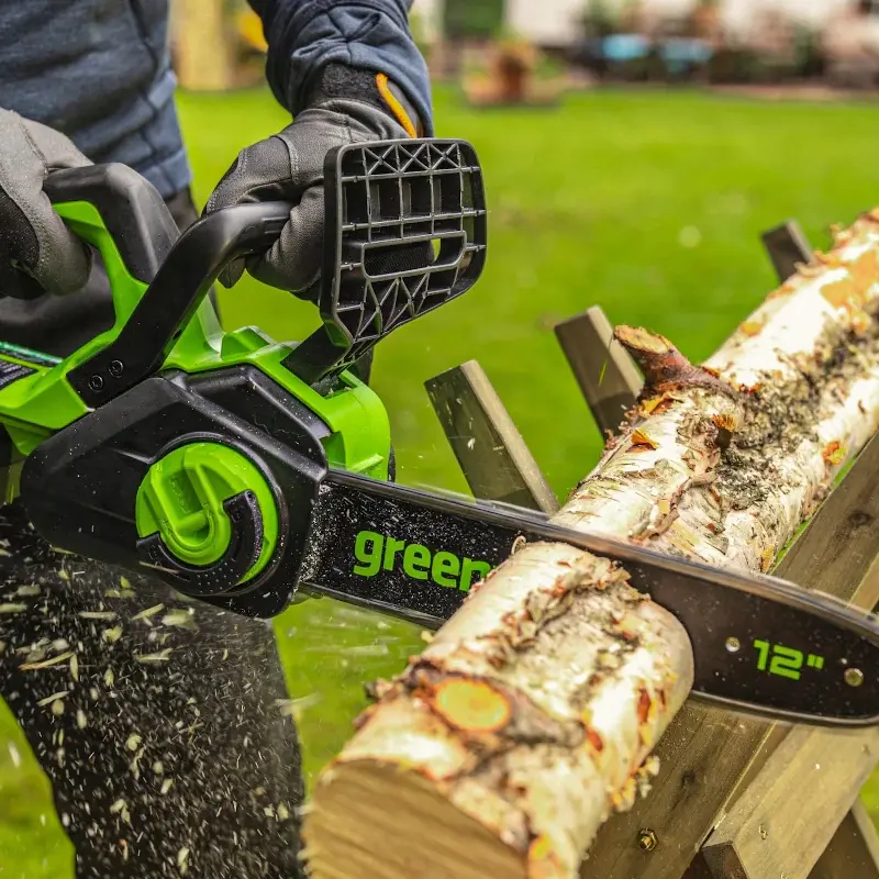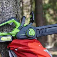 Цепная аккумуляторная пила Greenworks GD24CS30 используется в приусадебном хозяйстве для валки деревьев, обрезки веток, распиловки бревен. Максимальная скорость вращения цепи на холостых оборотах достигает 7,8 м/с, обеспечивает высокую эффективность даже при пилении сырой древесины.