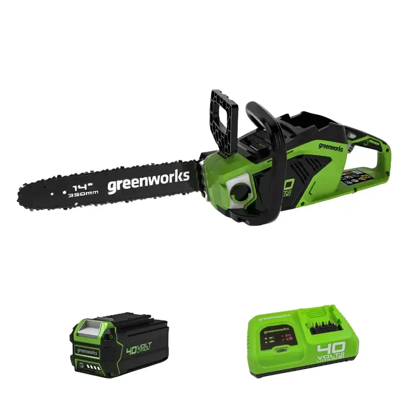Пила оснащена шиной (35 см) из кремнистой стали и цепью производства компании Oregon. Масляный бачок для смазки цепи имеет прозрачный корпус, чтобы вы всегда могли следить за уровнем масла. Для безопасности предусмотрен предохранитель включения и тормоз цепи. Для долговечной работы двигатель имеет защиту от перегрузки. Пила работает от аккумуляторной батареи G-MAX 40V, которую можно использовать с другими устройствами линейки 40V (15+ устройств).