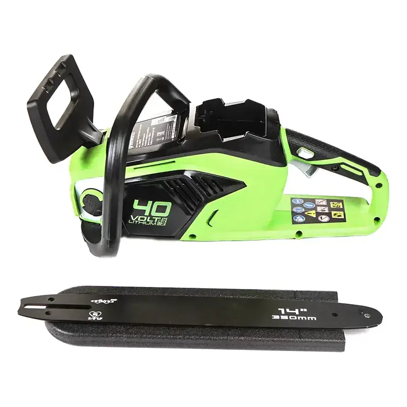 Пила оснащена шиной (35 см) из кремнистой стали и цепью производства компании Oregon. Масляный бачок для смазки цепи имеет прозрачный корпус, чтобы вы всегда могли следить за уровнем масла. Для безопасности предусмотрен предохранитель включения и тормоз цепи. Для долговечной работы двигатель имеет защиту от перегрузки. Пила работает от аккумуляторной батареи G-MAX 40V, которую можно использовать с другими устройствами линейки 40V (15+ устройств).