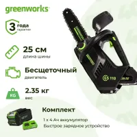 В комплект поставки также входят Аккумулятор Greenworks G40B4 (40 В, 4 Ач) и Быстрое зарядное устройство Greenworks G40UC5 (40 В, 5 А)