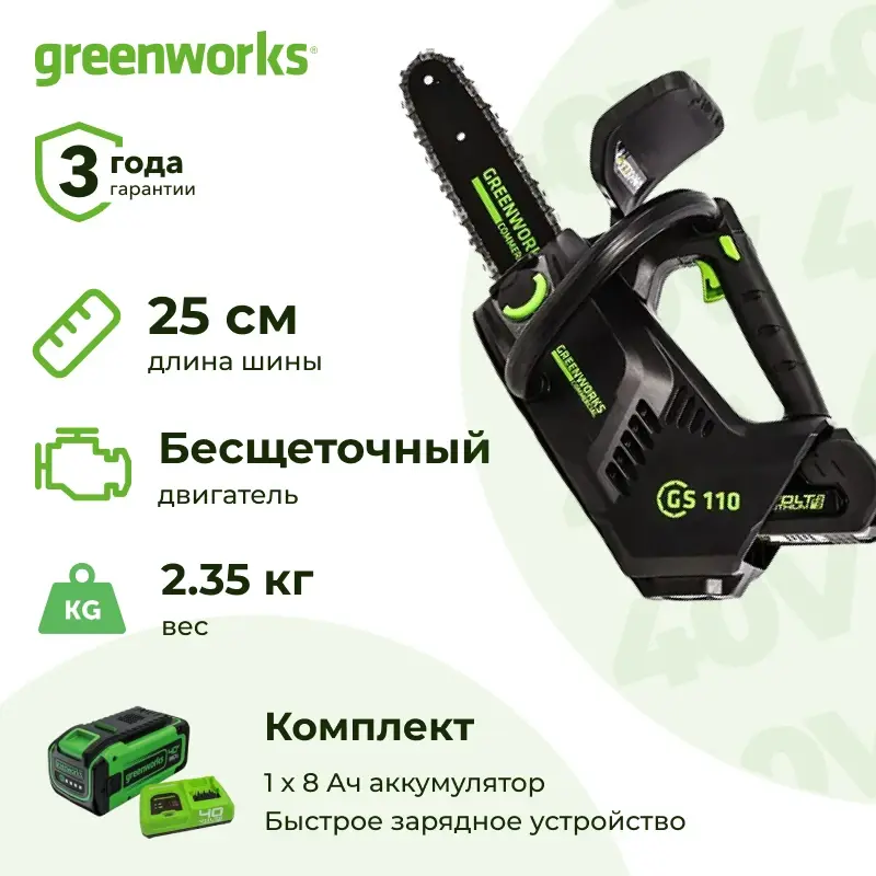 В комплект поставки также входят Аккумулятор Greenworks G40B8 (40 В, 8 Ач) и Быстрое зарядное устройство Greenworks G40UC5 (40 В, 5 А)