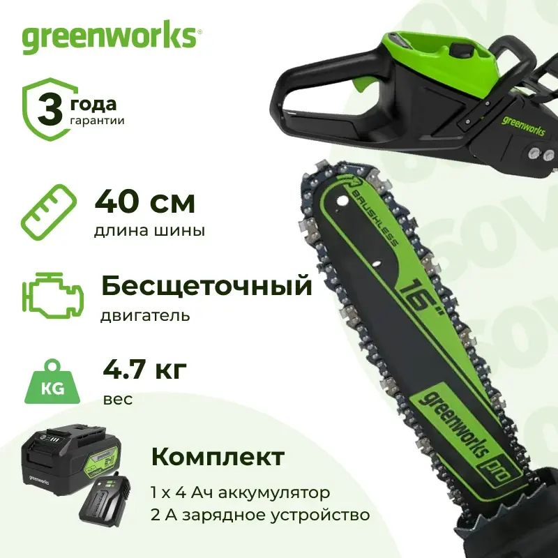 Цепная аккумуляторная пила Greenworks GD60CS25K4 (1 x 4 А·ч, ЗУ) из мощной полупрофессиональной линейки 60V. Равнозначная замена бензинового инструмента. Предназначена для распиловки бревна, бруса, валки деревьев.