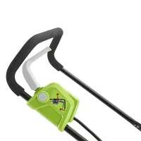 Небольшой вес в 14,5 кг и маневренные колеса делают управление легким. Прорезиненная рукоятка не даст рукам соскочить, даже при внезапном резком движении вы не потеряете контроль над газонокосилкой. Низкий уровень шума позволит скашивать траву по утрам, не разбудив остальных жильцов.