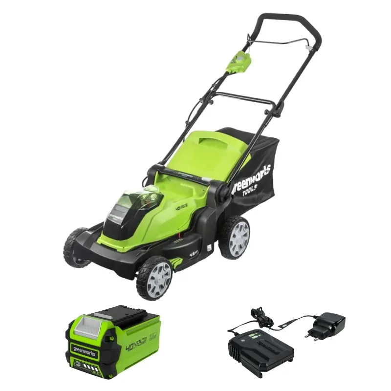 Благодаря тому, что питание косилки происходит от аккумулятора, ее вес меньше по сравнению с аналогами на бензиновых двигателях. Отсутствует вредный для вашего здоровья фактор выхлопов, уменьшен уровень шума и вибрации. Машина не требует дополнительного технического обслуживания, так как производитель снабдил модель достаточным количеством смазки внутренних движущихся деталей. Газонокосилка Greenworks G40LM41 оборудована корпусом из специального «мягкого» пластика, который не потрескается при попадании в него мелких камешков в процессе эксплуатации. Двигатель и лезвия защищены от механических повреждений специальной системой на случай попадания твердых объектов. Рукоятка складывается для удобства при транспортировке и хранении.