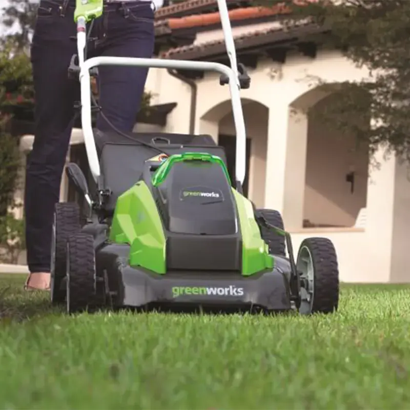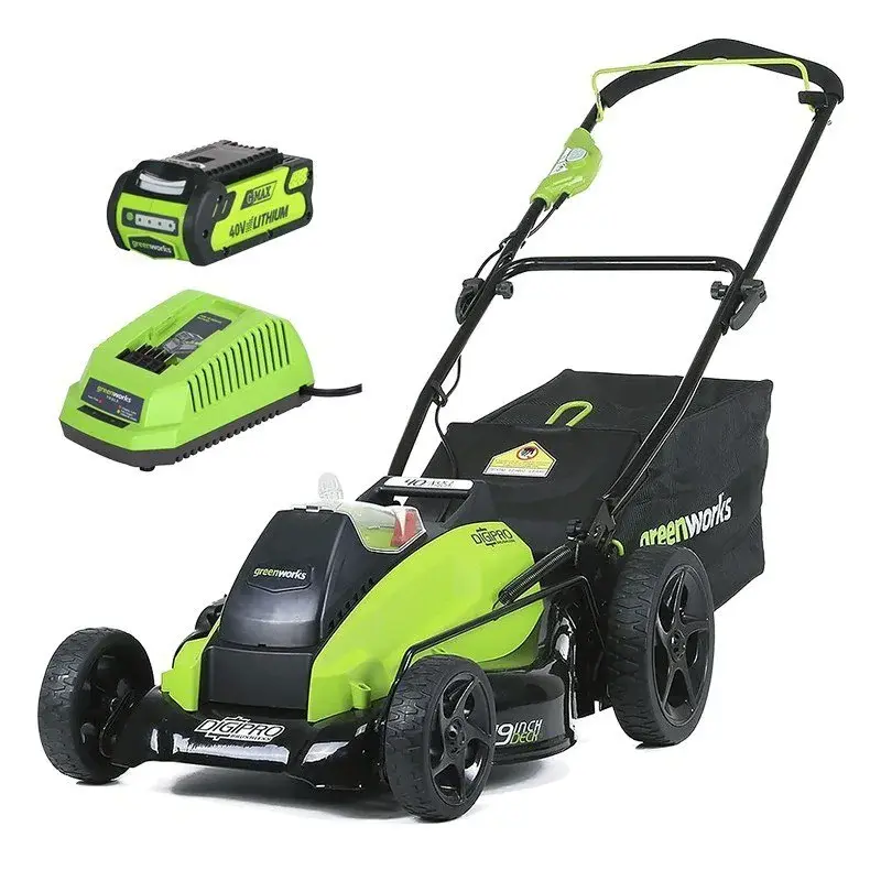 Газонокосилка аккумуляторная Greenworks линейки устройств 40 вольт (модель G40LM45K2) - вполне сопоставима по своим характеристикам с бензиновыми газонокосилками и имеет ширину скашивания 45 см.