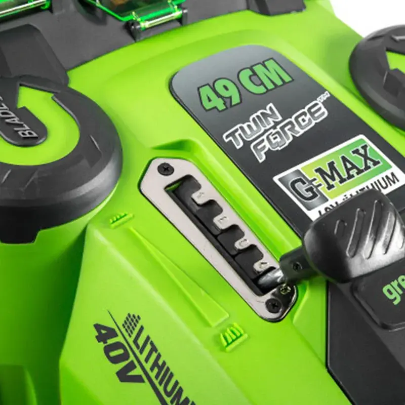 Два аккумуляторных двигателя газонокосилки Greenworks G40LM49DB самостоятельно настраивают мощность и скорость вращения вала, в зависимости от длины и жесткости травы. За счет интеллектуальной системы распределения энергии блок питания разряжается медленнее, до конца используя весь заряд.
