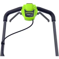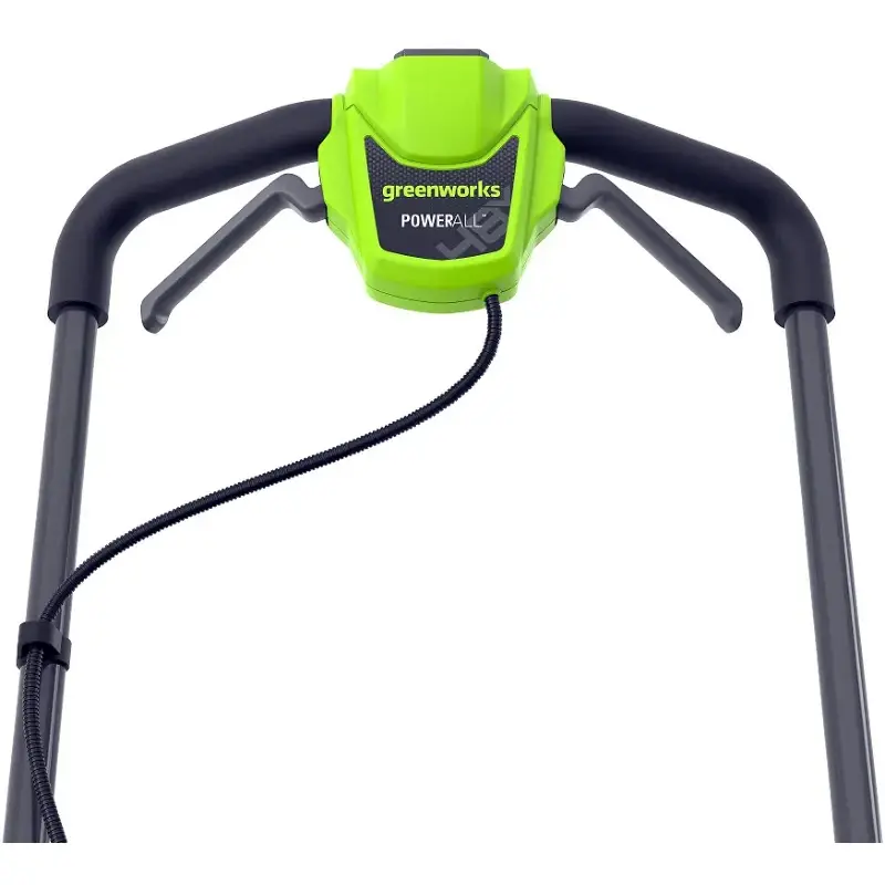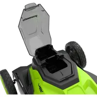 Ручка складывается в три раза для экономии места в гараже или багажнике автомобиля. Колеса с шарикоподшипниками обеспечивают плавный ход. За счет разного диаметра передней и задней колесной пары, 18 см и 20 см соответственно, косилка легко преодолевает неровности рельефа. Кнопка блокировки предотвращает случайное включение газонокосилки Greenworks GD24X2LM411. Защита от перегрузки продлевает срок службы двигателя. Ударопрочный пластик деки не боится камней и веток.