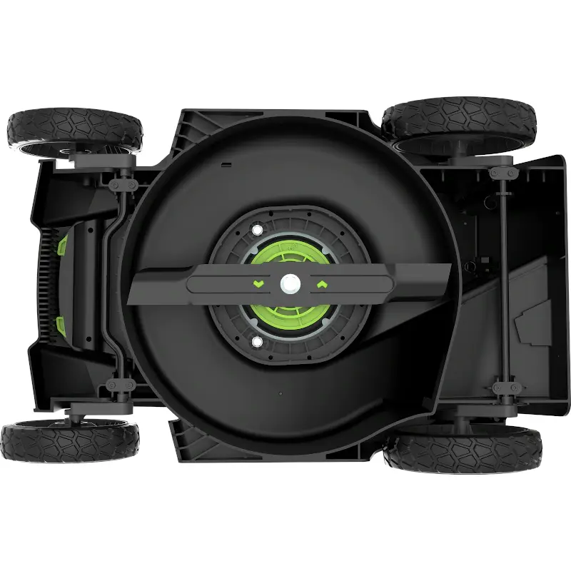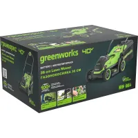Большие колеса (15 см передние / 18 см задние) с рельефным протектором легко катятся даже по неровной поверхности. Эргономичная ручка имеет мягкое покрытие и два рычага запуска двигателя — под правую и левую руки. После работы рукоятку можно сложить вдоль корпуса — так газонокосилка Greenworks GD40LM361 займет меньше места при хранении.