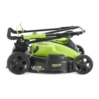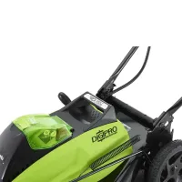• Корпус газонокосилки Greenworks выполнен из специального пластика, при попадание небольших камней на который он не потрескается, а дека газонокосилки выполнена из стали.