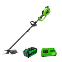 Аккумуляторный триммер Greenworks GD40BC — отличный выбор для тех, кто ищет мощный, удобный и автономный инструмент для скашивания травы на дачном участке. Входящий в комплектацию мощный 40-вольтовый аккумулятор емкостью 8 Ач обеспечивает до двух часов работы. Рабочие насадки — леска диаметром 2 мм и металлический диск — справляются с травой, бурьяном и даже кустарниками. Разборная конструкция штанги облегчает перевозку и хранение электрокосы.