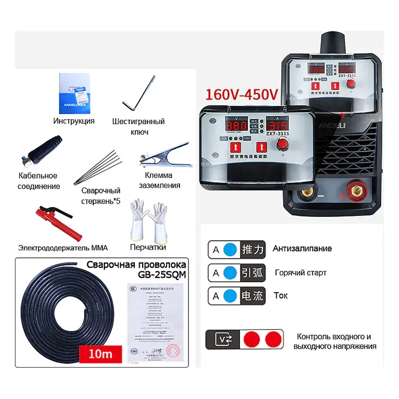 ANDELI ARC-315 cварочный аппарат инверторного типа предназначен для ручной дуговой сварки и наплавки штучным электродом на постоянном токе стальных изделий в производственных и бытовых условиях. Он отличается стабильной, надежной и эффективной работой и портативностью.