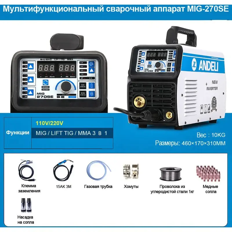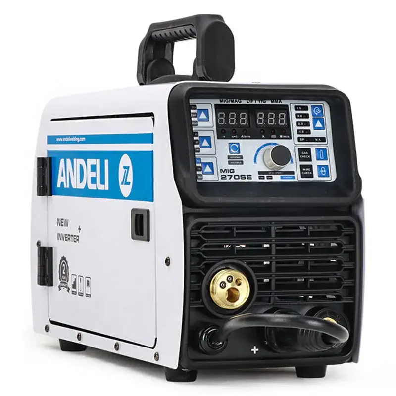 Сварочный аппарат Andeli MIG 270SE - профессиональная модель, которая может работать от напряжения 110 либо 220 В на ваш выбор. Номинальная мощность при этом будет составлять 4,7 кВт и 7,8 кВт соответственно. Устройство не требует специального технического обслуживания, обладает прочной конструкцией, а управлять им понятно и удобно.