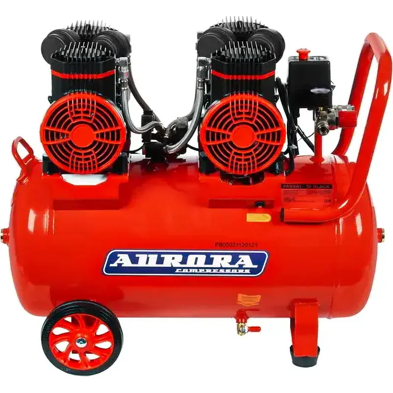 Технологические отверстия, расположенные с обоих торцов ресивера, позволяют отслеживать появление коррозии и проверять качество сварных швов с внутренней стороны. Внизу накопительного бака находится сливной клапан, через который можно удалять конденсат. Компрессор Aurora PASSAT-50 BLACK оснащен амортизирующими опорами, снижающими вибрацию. Колеса облегчают транспортировку устройства.