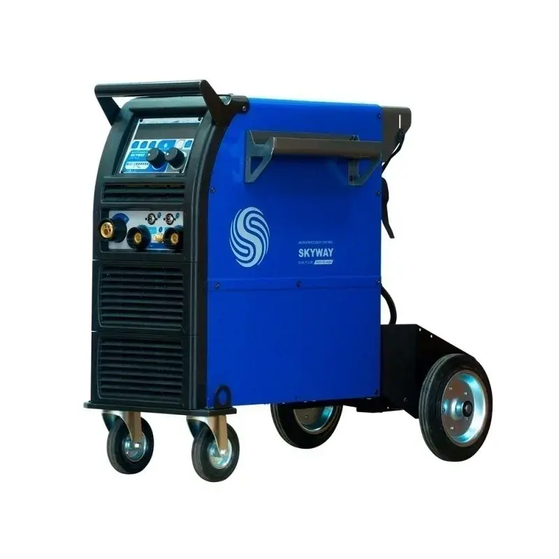 Инверторный сварочный полуавтомат AuroraPRO SKYWAY 350 DUAL PULSE с воздушным охлаждением позволяет работать в режимах MIG-MAG, TIG, а также MMA. Модель совместима с катушками D300 весом до 20 кг, а также имеет тележку с подставкой для баллона, что упрощает использование техники.