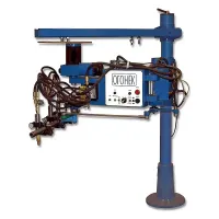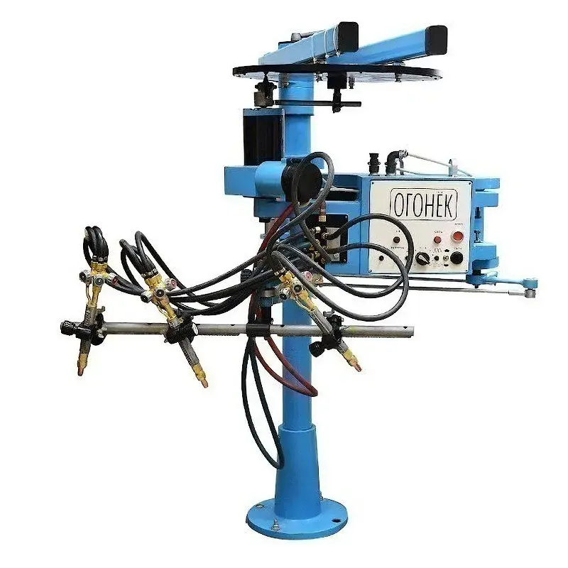 Машина шарнирная «Огонек» предназначена для газопламенной резки листов различных типов стали (низкоуглеродистая, нелегированная, низколегированная). Газорезательная машина способна выполнять качественные фигурные и прямолинейные резы, а также вырезки в виде круглых дисков. Машина может эксплуатироваться на судостроительных и металлообрабатывающих предприятиях, а также на строительно-монтажных площадках. К ключевым особенностям и преимуществам этой модификации можно отнести: - Основной несущей частью машины является колонна, на которой установлен кронштейн, служащий неподвижным звеном в шарнирной системе, состоящей из кронштейна, внутренней рамы и наружной рамы; - Система газопитания обеспечивает управление подачей газов на три резака и, в случае необходимости, на каждый резак в отдельности; - Шарнирная резательная машина оснащена приводным магнитным пальцем, работающим по копирам, изготовляемым самим пользователем; - Пульт управления, расположенный на кронштейне машины, обеспечивает следующие рабочие функции машины: включение и выключение электропитания и подачи газов, движение магнитного пальца по копиру в прямом и обратном направлениях, плавное бесступенчатое регулирование скорости перемещения; - Газорезательная машина обеспечивает качественный рез листов толщиной от 5 до 100 мм; - Машина газовой резки может эксплуатироваться при температуре окружающей среды от +5 ? до +35 ?C и относительной влажности воздуха до 80%.