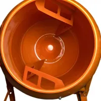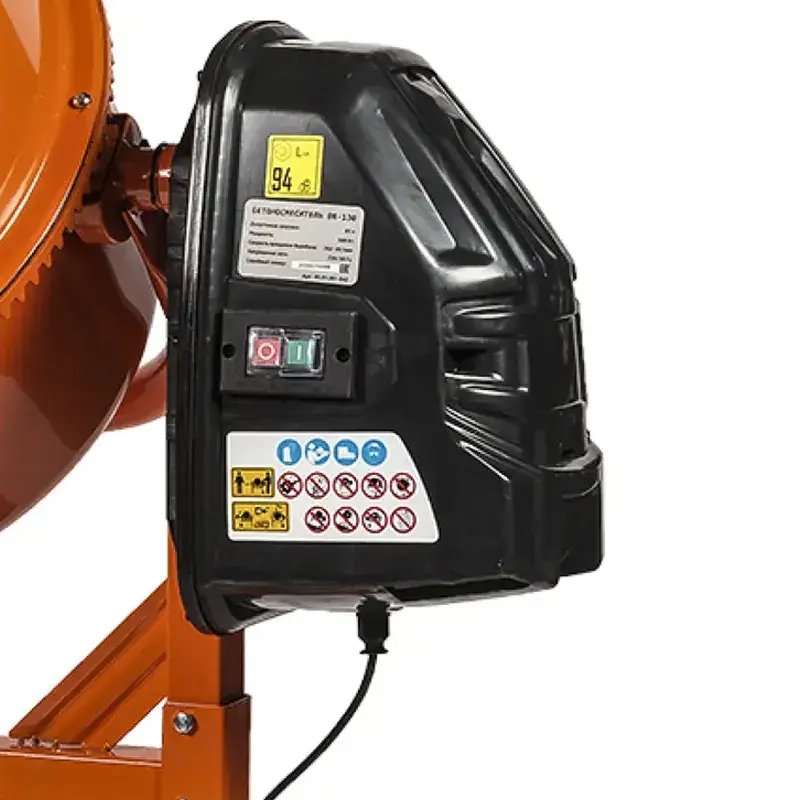 Скорость вращения барабана 29,5 об/мин позволяет качественно перемешивать компоненты бетонных смесей, строительных и отделочных растворов. Бетономешалка имеет удобный механизм регулировки наклона барабана при помощи ножной педали и поворотного колеса. Емкость можно установить в удобном положении для хранения, перемешивания, загрузки или выгрузки. Простое управление осуществляется при помощи двух кнопок: зеленой, используемой для включения, и красной — для выключения. Прочные колеса облегчают перемещение бетономешалки по участку. Уровень шума во время работы не превышает 93 дБ.
