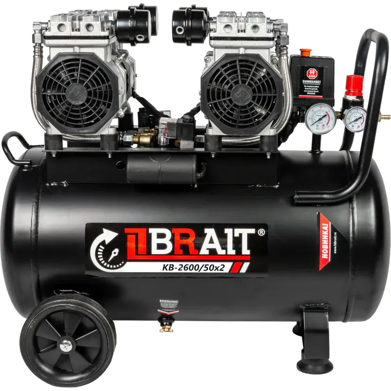 Воздушный компрессор BRAIT КB-2600/50Х2 используется для производства сжатого воздуха в большом объеме. Конструкция включает в себя ресивер. Это позволяет воспользоваться запасом сжатого воздуха и избежать кратковременных включений двигателя.