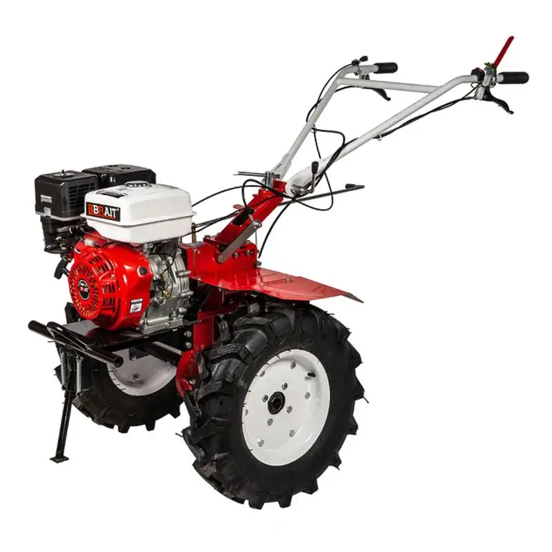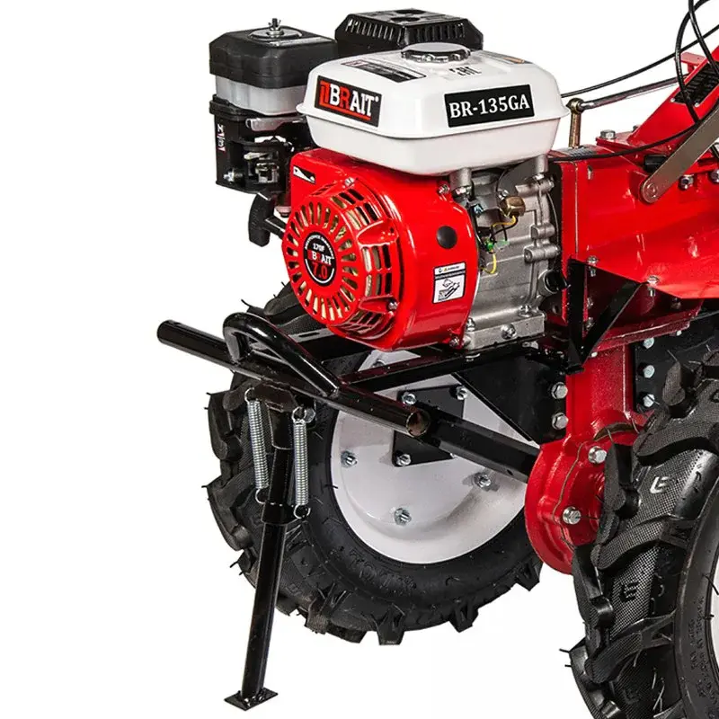 Бензиновый мотоблок BRAIT-135GA - предназначен для обработки больших участков земли. Мощность двигателя даёт возможность применять в работе широкий спектр навесного оборудования. Агрегат имеет вал отбора мощности. Мотоблок можно дополнить роторной сенокосилкой, мотопомпой, снегоуборочной приставкой и другим оборудованием. Топливный бак объёмом 3,6 литра и экономичный расход топлива, дают возможность долгое время работать без дозаправки. Высококачественная коробка передач имеет 2 скорости вперёд и 1 назад. Аппарат оснащён мощным, цельнолитым чугунным редуктором, созданным специально для эксплуатации в жёстких условиях на тяжёлых грунтах и для обработки целины. Зубчатая передача, которая сообщает крутящий момент двигателя колёсам и фрезам, отличается надёжностью и долговечностью. Сцепка мотоблока изготовлена с большим запасом прочности и позволяет работать не только с сошником, плугом или окучником, но и с телегой. Мотоблок адаптирован с навесным оборудованием КАСКАД/ЦЕЛИНА. Ширину обработки при работе с фрезами можно регулировать от 800 мм. до 1200 мм., кроме этого агрегат массой в 136 кг. способен работать плугом без дополнительного утяжеления. Шестигранные оси мотоблока (посадка 32мм.) обеспечивают надёжное соединение.
