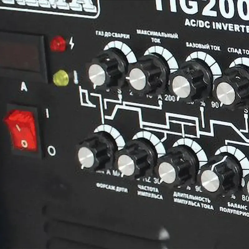 На панели управления расположены регуляторы. Каждый элемент подписан и имеет соответствующее обозначение, поэтому вы легко разберетесь в управлении. Сварочный инвертор BRIMA TIG-200 AC-DC позволяет задавать время продувки газа до и после работы. Это нужно для создания защитной зоны возле шва.