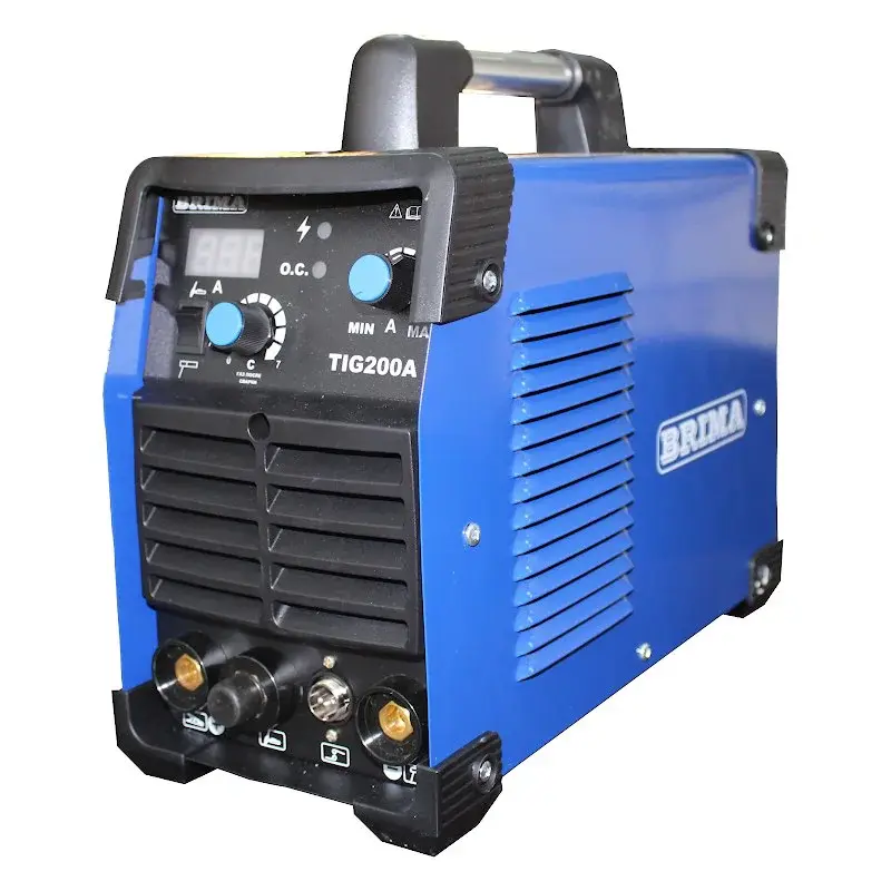 BRIMA TIG 200A — инверторная установка для аргонодуговой сварки неплавящимся вольфрамовым электродом (данный способ сварки в соответствии с ИСО 4063-90 имеет следующее сокращение – TIG Tungsten Inert Gas) таких материалов, как нержавеющая, углеродистая и легированная стали, сплавы титана, меди и др. Особенности Бесконтактный поджиг и газовый тракт, позволяющий минимизировать расход защитного газа. У данного аппарата имеется регулятор времени продувки газа после сварки, который обеспечивает защиту шва и электрода по окончанию сварки. Данный сварочный аппарат поддерживает режим ручной дуговой сварки покрытым электродом (данный способ сварки в соответствии с ИСО 4063-90 имеет следующее сокращение – MMA Manual Metal Arc). При коротком замыкании электрода, напряжение дуги автоматически снижается до 0 вольт, что не позволит повредиться электроду и избавит от загрязнения свариваемый металл. Сварочный ток аппарата TIG-200 A BRIMA можно с помощью регулятора на панели управления с диапазоном от 10 до 200 А с четкой шкалой и понятным символьным обозначением. На лицевой панели расположен индикатор сети. Также имеется индикатор защиты, который срабатывает в результате перегрузки. Аппарат самостоятельно включится, когда температура внутри опустится до необходимого уровня. Имеет хороший период нагрузки ПН=60% и класс защиты IP 21 S. Обладает высокими сварочными характеристиками – регулировка сварочного напряжения производится в соответствии с силой сварочного тока. При сварке в среде защитных газов действует уникальная схема управления, что обеспечивает меньшее разбрызгивание, стабильную дугу при сварке, отличное качество сварного шва и высокую производительность в целом.; Аппарат легко перемещать при монтаже по рабочей площадке, благодаря малому весу и рукоятке, расположенной на верхней части корпуса.