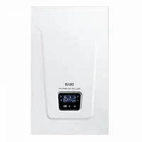 На дисплее с подсветкой отображаются рабочие параметры, такие как ступень мощности, температура теплоносителя, код ошибки и прочие. Котел функционирует по графику, указанному в настройках. Благодаря возможности установки трехходового клапана к электрическому котлу BAXI можно подключить бойлер для организации горячего водоснабжения. В этом случае становится доступной функция «антилегионелла». Она предназначена для периодического нагрева воды в контуре ГВС до высокой температуры с целью уничтожения болезнетворных бактерий и обеззараживания бака.