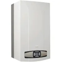 Двухконтурный аппарат служит для отопления помещений и ГВС. Котел нагревает 450 л воды за первые полчаса работы благодаря встроенному бойлеру с 60-литровым накопительным баком. Выносную панель управления можно установить в любом удобном месте.