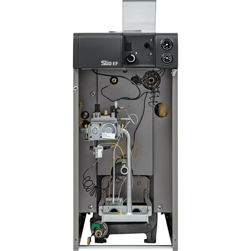 Желаемая температура нагрева для напольного котла Baxi SLIM EF 1.22 задается отдельным регулятором в диапазоне от 45 до 85 °C. Дополнительно можно подключить комнатный термостат. Есть термометр и манометр для удобного отслеживания рабочих параметров газового котла. Модель перенастраивается под работу на сжиженном газе, если вам это потребуется.