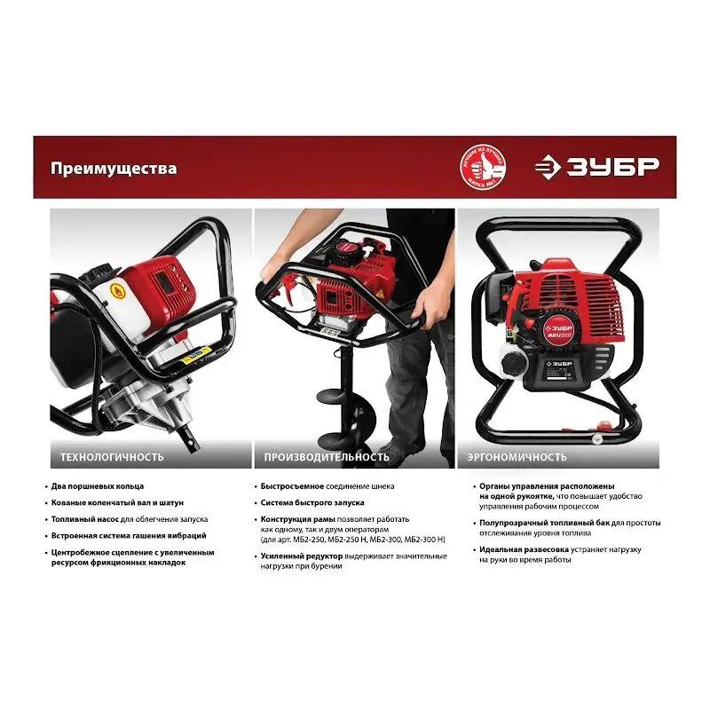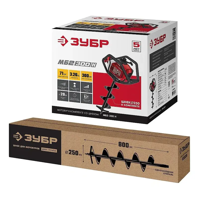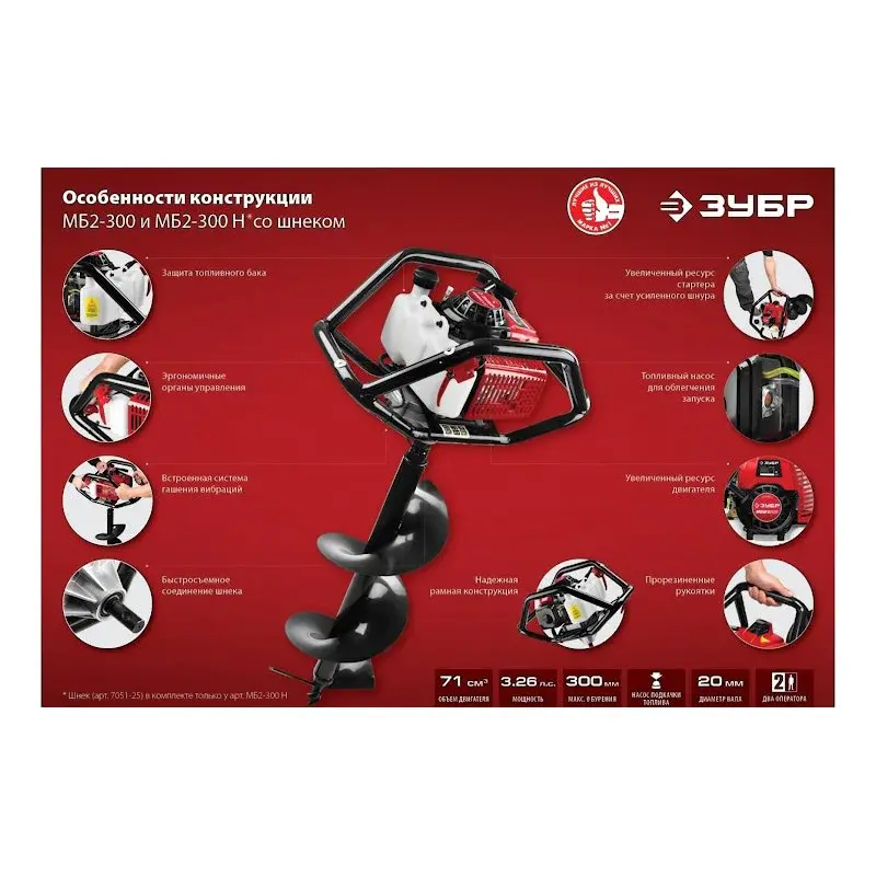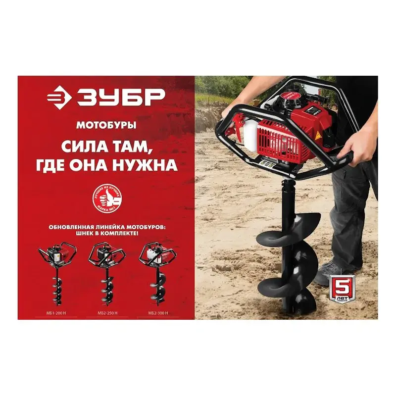 Мотобур Зубр МБ2-300 Н используется для сверления скважин во льду и в земле. Устройство оснащено 2-тактным двигателем мощностью 3,26 л.с, который подходит для продолжительных работ. В комплекте поставляется шнек длиной 80 см.