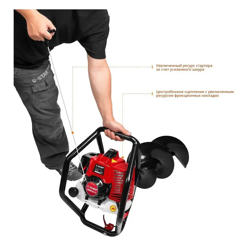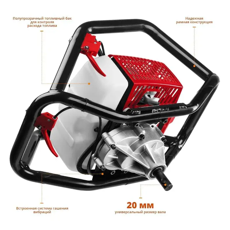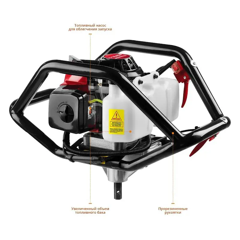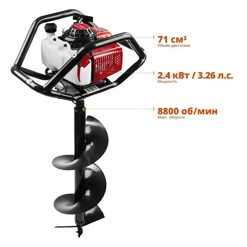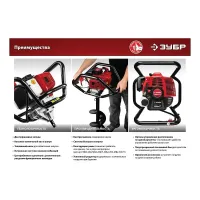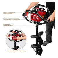 Благодаря скорости вращения шпинделя в 8800 об/мин, бензобур подходит для песков, торфа, гравия, глины. Устройство пригодится при установке уличных фонарей освещения и столбов, бурения скважин, забора проб грунта и других аналогичных работ.