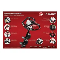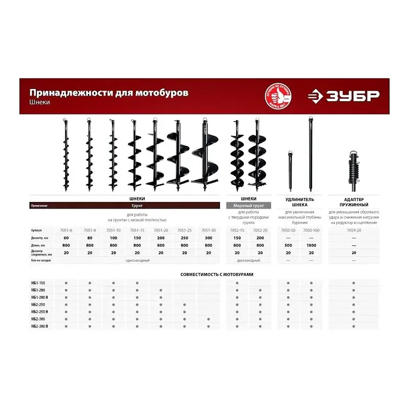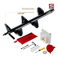 В зависимости от вида работ и плотности обрабатываемой поверхности можно использовать шнеки диаметром от 60 до 300 мм. Крепление оснащено быстросъемным зажимом, благодаря чему извлечение и установка оснастки происходит без использования ключей, отверток и других приспособлений. В комплекте поставляется бур диаметром 250 мм и длиной 800 мм.