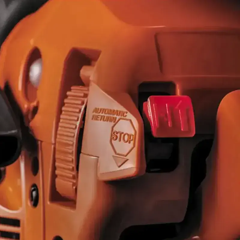 Рычаг блокировки курка газа не допускает случайный запуск пилы, он автоматически замыкается на холостых оборотах. Металлический уловитель цепи останавливает ее при обрыве. Расширенная задняя ручка предохраняет правую ладонь от попадания веток и других твёрдых предметов, отбрасываемых шиной во время работы.