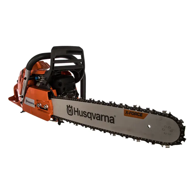 Длина стандартной пильной шины серии X-Force - 18”. Инструмент совместим с шинами до 27”. Аксессуар отличается повышенной износостойкостью. Для натяжения цепи используется боковой регулятор. Менять его положение можно с помощью отвертки.