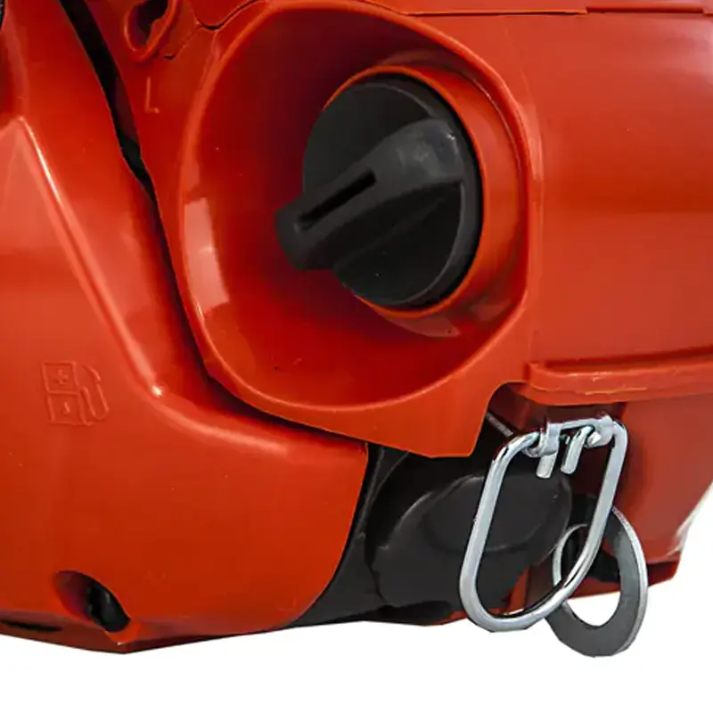 Блокировка ручки газа защищает от непроизвольного включения двигателя, он работает только при нажатой кнопке. Уловитель цепи захватывает ее при внезапном соскальзывании или обрыве. Глушитель уменьшает звуковое давление до 103 дБ и направляет выхлоп вперед, сдувая опилки во время работы.