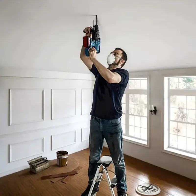 Вспомогательный держатель вращается вокруг оси Bosch GBH 180-LI для установки в наиболее удобном положении. На нем закреплена ограничительная рейка, фиксирующая глубину сверления. При нажатии на рычаг включения, автоматически загорается светодиод, который подсвечивает рабочую зону.