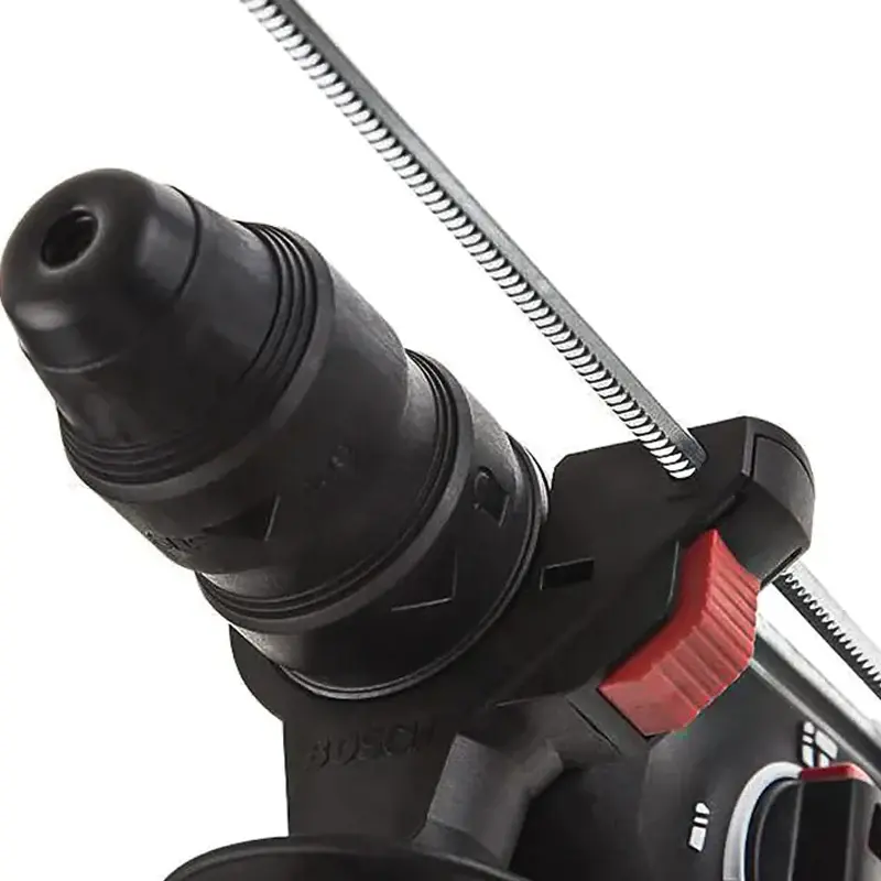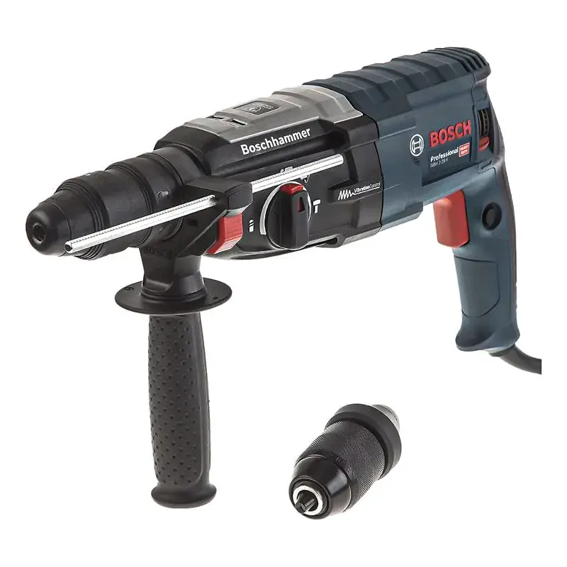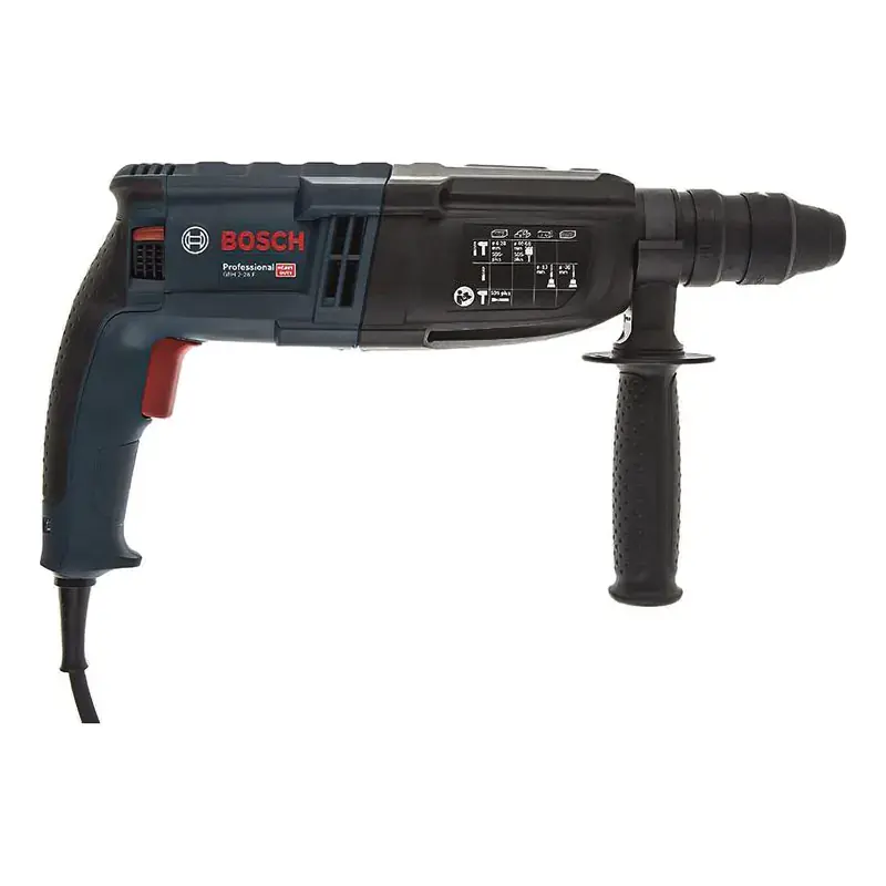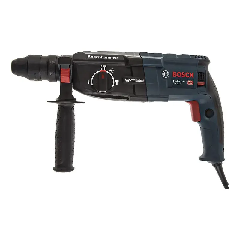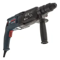 Перфоратор Bosch GBH 2-28 F Professional отличается максимальной в своем классе производительностью. Это профессиональная модель с пистолетной рукояткой позволяет производить сверление по бетону диаметром до 28 мм, а также работать в безударном режиме с деревом и металлом. Диаметр отверстий от 13 мм до 30 мм соответственно. Функция блокировки вращения патрона позволяет использовать его в качестве отбойного молотка. Особенности перфоратора Bosch GBH 2-28 F Professional Защита от травматизма и перегрузки перфоратора. Удобная рукоятка, гасящая вибрацию во время работы. Быстрозажимной патрон для удобной смены сверла. Фиксация выключателя в нажатом состоянии. Возможность изменения направления вращения. Профессиональный инструмент оснащен системой защиты Kickback Control. Она предохраняет от внезапных рывков при заклинивании сверла. В случае возникновения такой ситуации электродвигатель прекращает работать за доли секунды. Благодаря этому исключается перегрузка инструмента и последствия нештатных ситуаций. Сетевой перфоратор имеет удобную рукоятку с мягкой накладкой для комфортного удержания во время работы. А использование дополнительных резиновых креплений способствует существенному снижению уровня вибрации. Минимизация вибрационных колебаний позволяет точнее контролировать позицию сверла в рабочей области и гарантирует более качественный результат. Быстрозажимной патрон AutoLock легко откручивается и закручивается для крепления инструментов. Благодаря такой конструкции вам не нужно использовать дополнительные приспособления для смены оснастки, а сам процесс не занимает много времени и выполняется в два движения. Функция блокировки выключателя обеспечивает непрерывную работа перфоратора без необходимости держать нажатой основную кнопку. Это существенно снижает утомляемость при непрерывной работе. Электрический перфоратор оснащен переключателем для смены направления вращения. Это позволяет использовать инструмент в качестве шуруповерта, а также запустить вращение в обратном направлении, например, при заклинивании сверла. А благодаря поворотному щеткодержателю патрон вращается с одинаковой мощностью в оба направления.