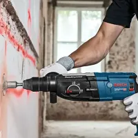 Перфоратор Bosch GBH 2-28 F Professional отличается максимальной в своем классе производительностью. Это профессиональная модель с пистолетной рукояткой позволяет производить сверление по бетону диаметром до 28 мм, а также работать в безударном режиме с деревом и металлом. Диаметр отверстий от 13 мм до 30 мм соответственно. Функция блокировки вращения патрона позволяет использовать его в качестве отбойного молотка.