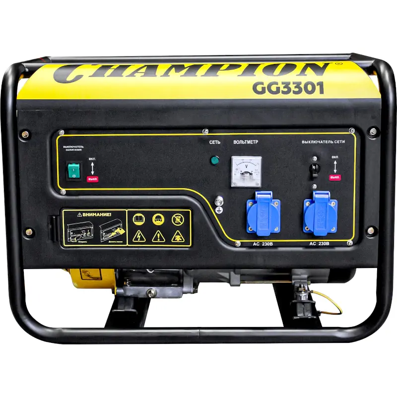 Бензиновый генератор CHAMPION GG3301 отличается простотой управления и надежностью в работе. В случае перебоев в электроснабжении мобильная электростанция способна обеспечить питанием подключенные приборы номинальной суммарной потребляемой мощностью 2,8 кВт. Бензогенератор пользуется популярностью у владельцев частных домов, строителей, рабочих выездных бригад. Четырехтактный двигатель мощностью 6 л.с. с воздушным охлаждением и ручным стартером работает на неэтилированном бензине АИ-92.