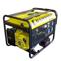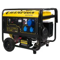 Бензиновый генератор Champion GG7501E с максимальной мощностью в 6,5 кВт позволяет питать оборудование суммарной мощностью до 6 кВт. Модель оборудована опорными ножками и транспортировочными колесами для простого перемещения. Для простого запуска предусмотрен электростартер.