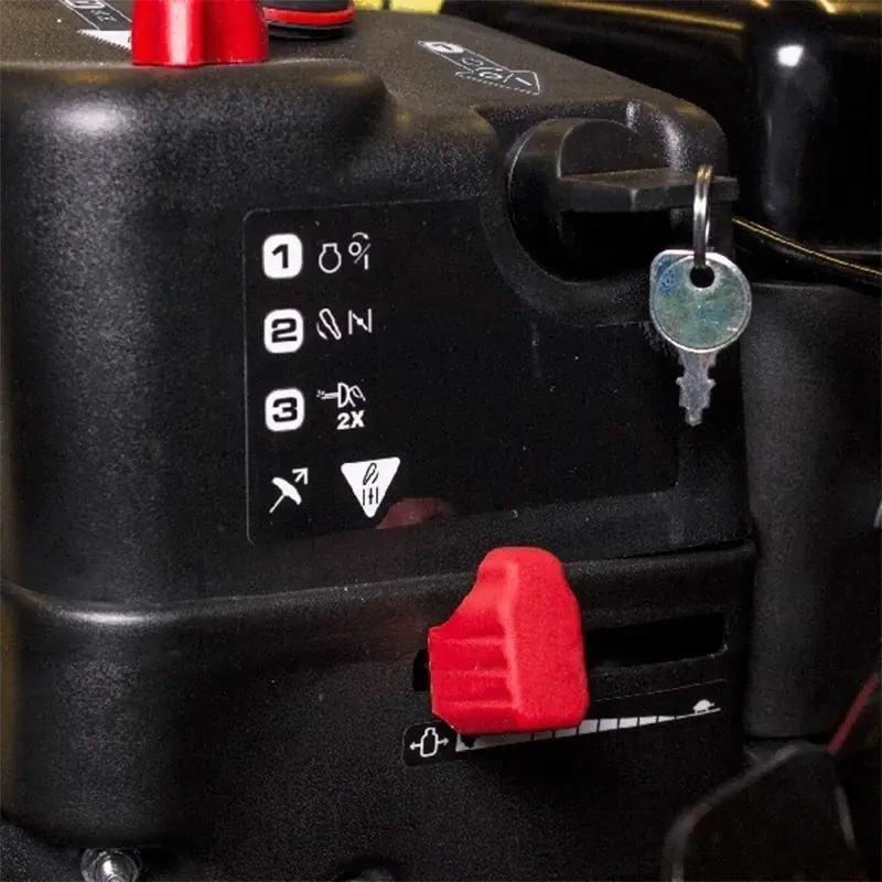 8-ступенчатая коробка передач позволяет адаптировать бензиновый снегоочиститель под конкретные условия работы и скорость уборки. Высота захвата составляет 54,5 см, что подходит для чистки глубокого снега. При необходимости можно увеличить или уменьшить обороты двигателя с помощью рычажка на корпусе. Функция поможет ускорить процесс уборки или снизить потребление бензина.