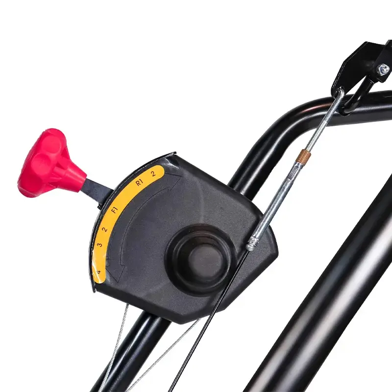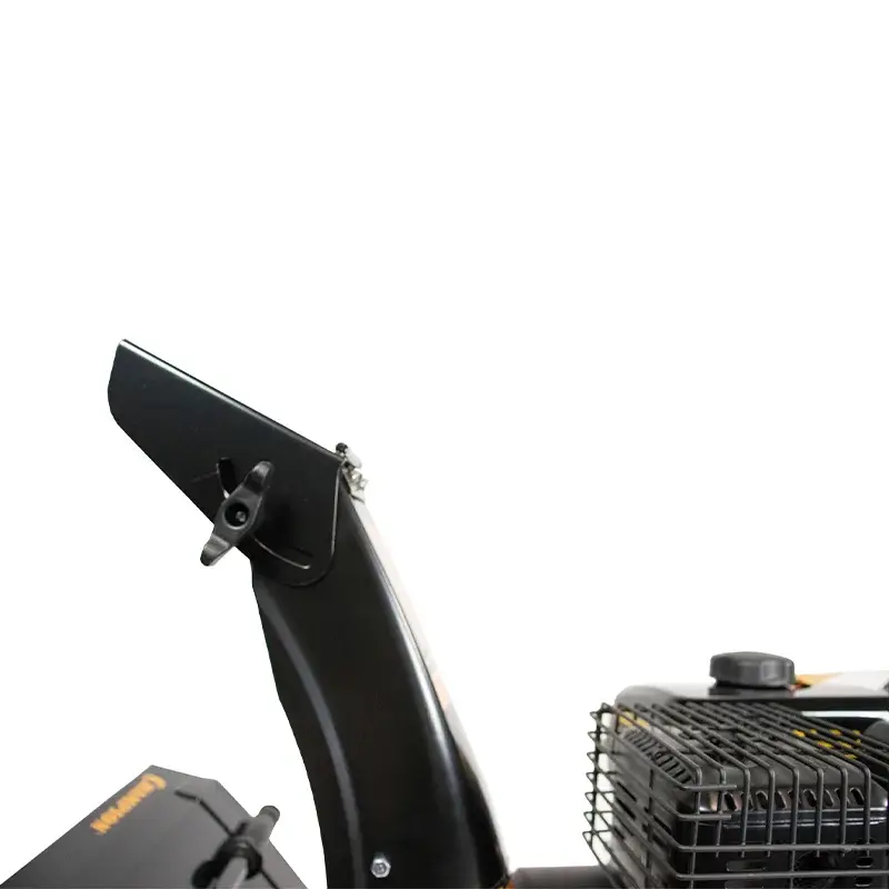 Снегоотбрасыватель Champion ST556 оснащен прочной стальной рамой, которая выдерживает большие нагрузки. На нее закреплены рычаги запуска хода машины и вращения шнека, их конструкция дает возможность удерживать обе рукоятки одной ладонью. Переключатель передач позволяет легко настроить удобную скорость движения инструмента.