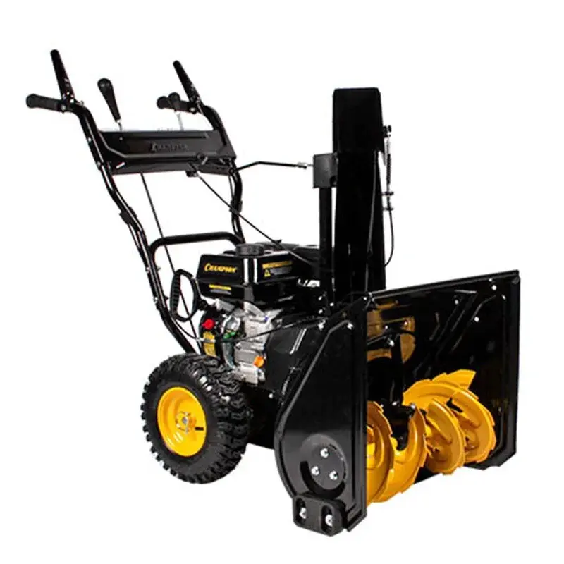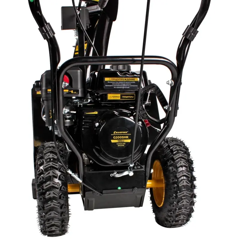 Бензиновый снегоуборщик CHAMPION ST661 с шириной захвата 61 см оборудован самоходным приводом, который включает в себя 4 скорости вперед и 1 назад. Направление выпускного желоба и наклон дефлектора регулируются с помощью рукояток на панели управления.