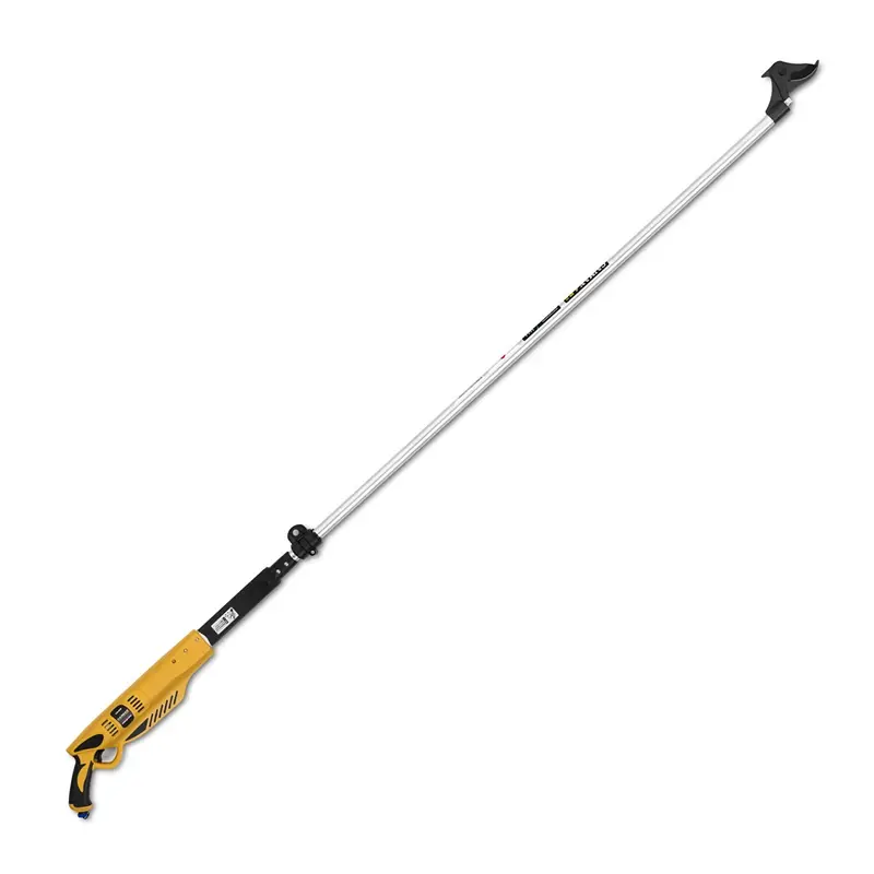 Аккумуляторный секатор на длинной штанге CAIMAN CN-947 позволяет вести обрезку сучьев и ветвей диаметром до 27 мм, находящихся на высоте от земли или в глубине кроны дерева, куда сложно дотянуться при помощи обычного инструмента. Штанга длиной 2 метра позволяет решать такую задачу наиболее удобным и безопасным способом – находясь на значительном расстоянии от ветки: например, стоя на земле, не прибегая к помощи стремянки, лестницы и не влезая на дерево. Наличие электромотора и малый вес инструмента (всего 2,19 кг) ускоряет и облегчает работу, так как не требует каких-либо значительных физических усилий для обрезки веток.