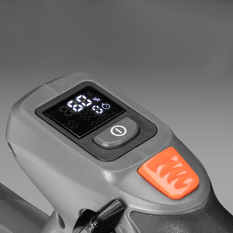 Дисплей показывает остаточную емкость аккумулятора, общее время работы, уведомления об обслуживании и ошибках. Под дисплеем расположен выключатель питания